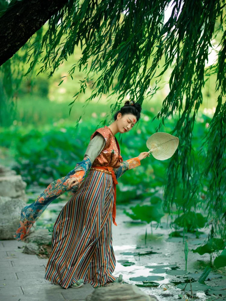 Made from beautiful brocade fabrics, the Beizi 背子 was a quintissential piece of Early Tang hanfu. With patterns of flying phoenixes and floral emblems, the vibrant colors of ancient murals are brought back to life.